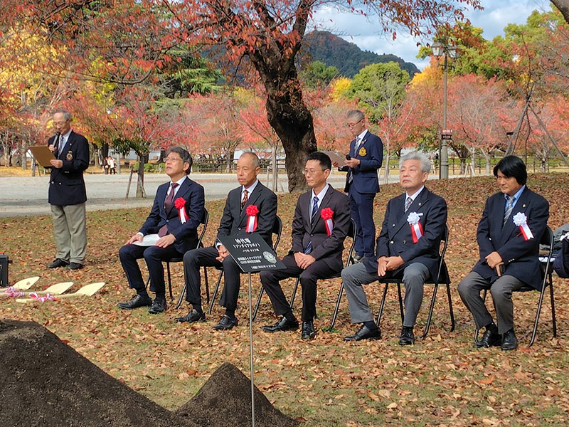 出席者の見守る中、静岡市都市局長の杉山様、会長L浅場、実行委員長L佐塚により植樹式(砂かけ)が行われ、桜の木「神代曙(じんだいあけぼの)」が美しい花を咲かせることを願いました。